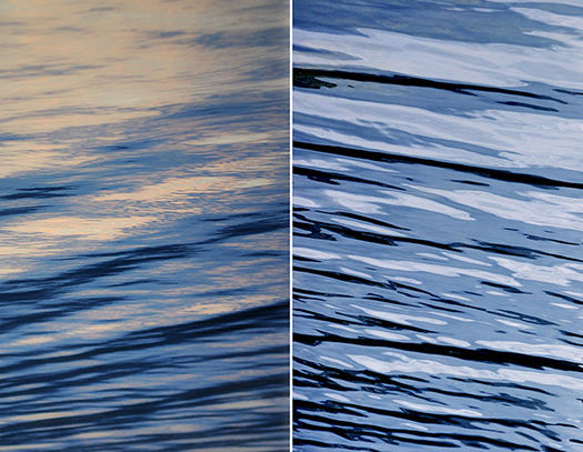 Depuis toujours, l'eau, liquide de la vie, me fascine par sa complexité visuelle. Ces diptyques font partie d'un projet en cours, 'Entropie liquide-Le monde fluctuant' axé sur l'exploration des formes de l'eau. Aussi réelle qu'elle soit, elle se fait abstraction: avec ses formes qui dansent et disparaissent, ses motifs de rides et de vagues, son rythme fluide, l'eau exprime l'impermanence. Ma relation émotionnelle avec ce monde fluctuant est caractérisée par une sorte de raréfaction et de nostalgie, comme dans un rêve où la surface dessine des courbes bleues et vertes. J'ai essayé de saisir ces formes dansantes, principalement dans les lacs de montagne, et de les révéler, en composant mes visions sous différents angles et perspectives. Dans mon cadre de post-production, j'ai joint deux images séparées par une mince ligne blanche, pour évoquer la relation entre le proche et le lointain, l'intime et l'infini, mais aussi pour souligner l'expérience de points de vue et de perspectives imprévus. Par conséquent, les frontières entre réalité et abstraction disparaissent en ouvrant un nouvel horizon.
